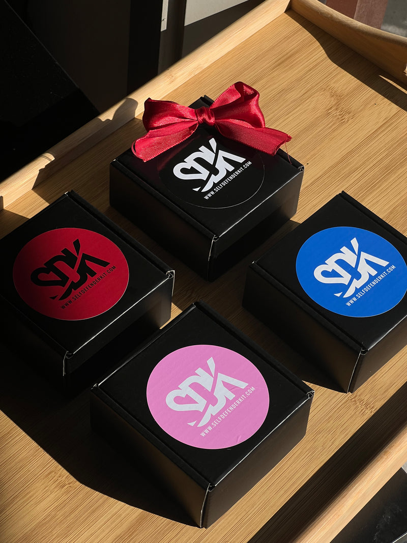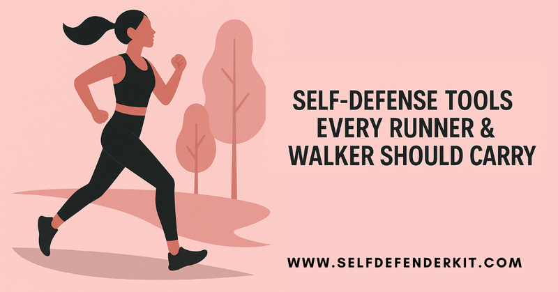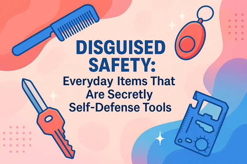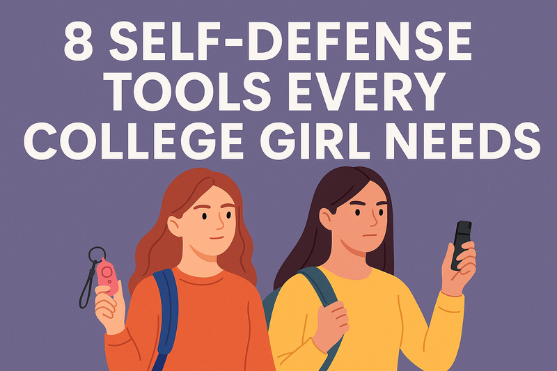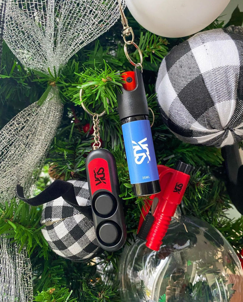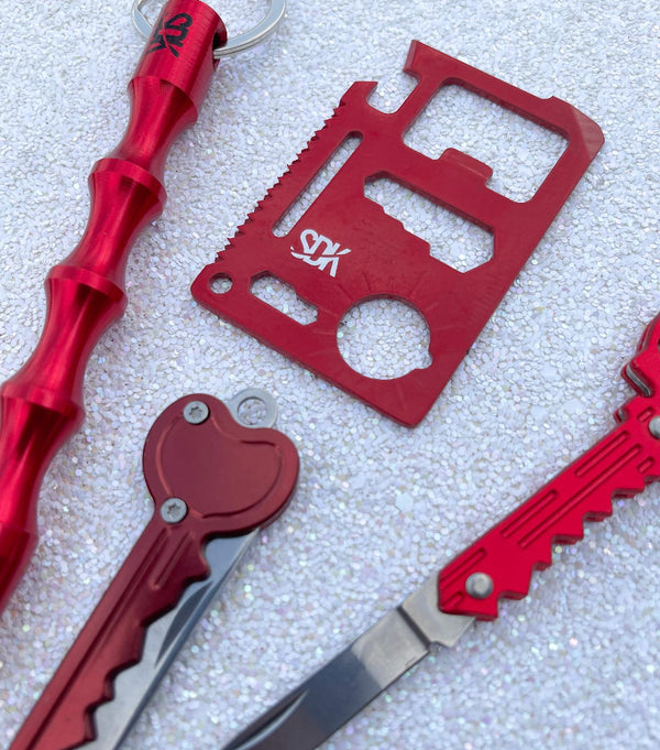 Pink self defense tool laid out. pepper spray, key knife, safety alarm, car escape tool